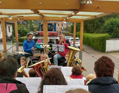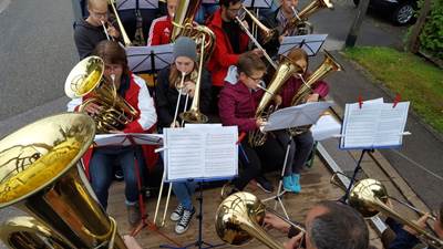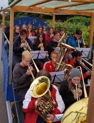 Zum ersten mal spielte unsere Jungbläsertruppe am Umzugswagen mit.