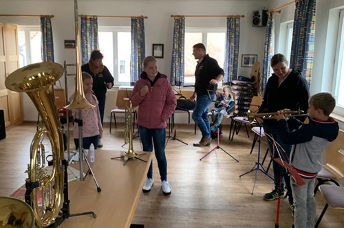 Nach dem "Kennenlern-Treffen" und Ausprobieren verschiedener Instrumente, hatten die zukünftigen Jungbläser ihr Instrument schnell gefunden und die Begeisterung für das Spielen war sofort entflammt. Zweimal pro Woche unter der Leitung von Stefan, Monja, Tanja, Kerstin und Hanna werden nun seit Oktober die Proben abgehalten.